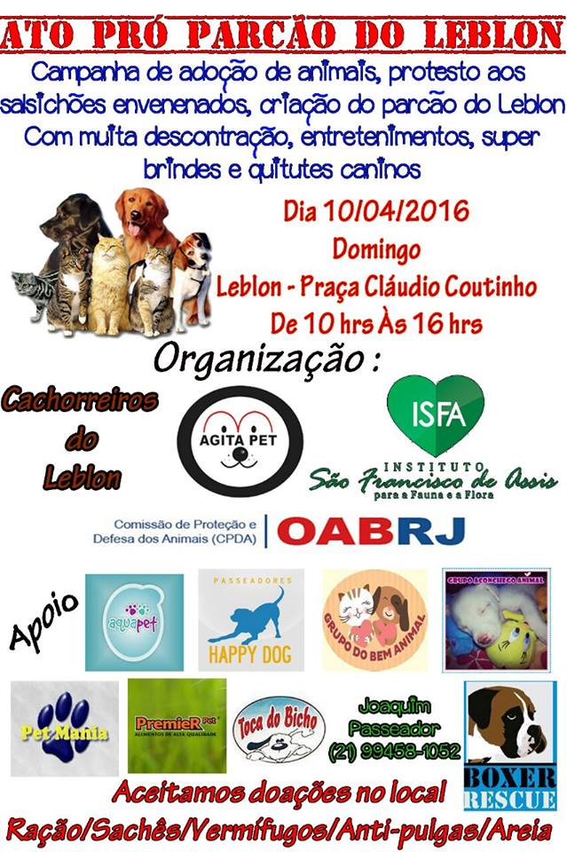 A Comissão de Proteção e Defesa dos Animais (CPDA) da OAB/RJ acertou nesta quinta feira, dia 7, uma parceria com a Associação Cachorreiros do Leblon e vai entrar na luta pela reinstalação do ParCão do Leblon. Criado em 2013, o espaço na Praça Claudio Coutinho era utilizado pelos cães da região, por ser cercado e ter regras de segurança. No entanto, desde 2014 o local está fechado. Alguns moradores solicitaram a retirada das grades limítrofes por não querer os animais na região.