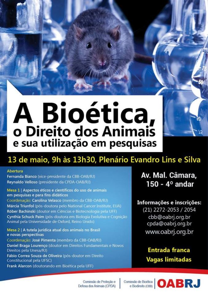 Esta é uma das razões pelas quais as Comissões de Proteção de Defesa dos Animais e Bioética e Biodireito da OAB/RJ estão promovendo o Seminário Bioética e Direito dos Animais . O evento será realizado nesta quarta, dia 13, às 9h, no Plenário da instituição, à rua Marechal Câmara,150/4° andar. Participarão os 6 maiores especialistas neste assunto, que discutirão as novas perspectivas das pesquisas sem o uso de animais.