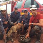 Na foto a mãezinha e seus filhotes, o bezerro, os equinos e os cães: vidas salvas pelos heróis.