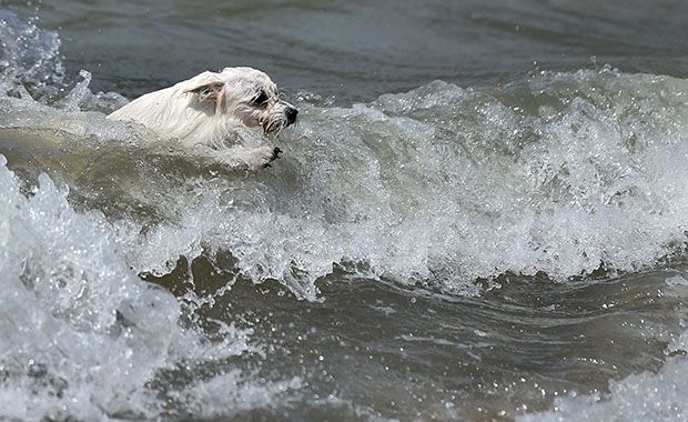 A dog swims at Baubeach in Maccarese, near Rome on August 12, 2014. At Beaubeach people accompanied by dogs can enjoy the beach during summertime. AFP PHOTO / GABRIEL BOUYS